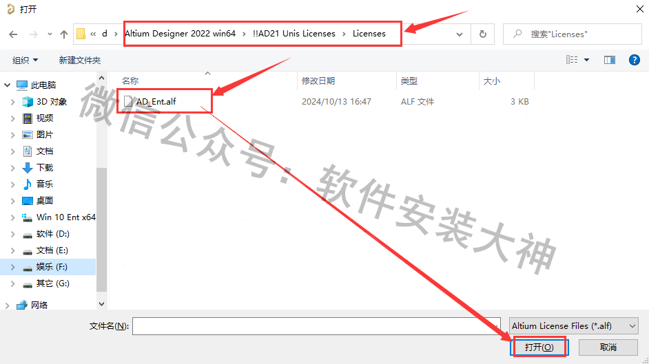 19、在弹出的框内,打开到开始解压出来的安装文件夹位置并打开【!!AD21 Unis licenses】文件夹,找到【licenses】文件夹并打开,选中里面的文件,点击【打开】