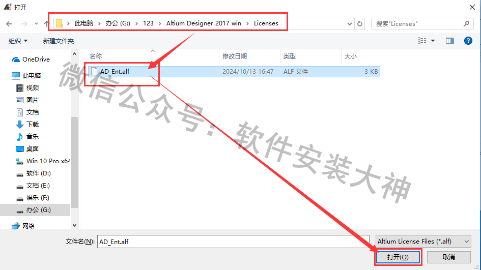 16、在弹出的框内,打开到解压出来的安装包,找到《Licenses》文件夹,选中里面的文件,点击《打开》