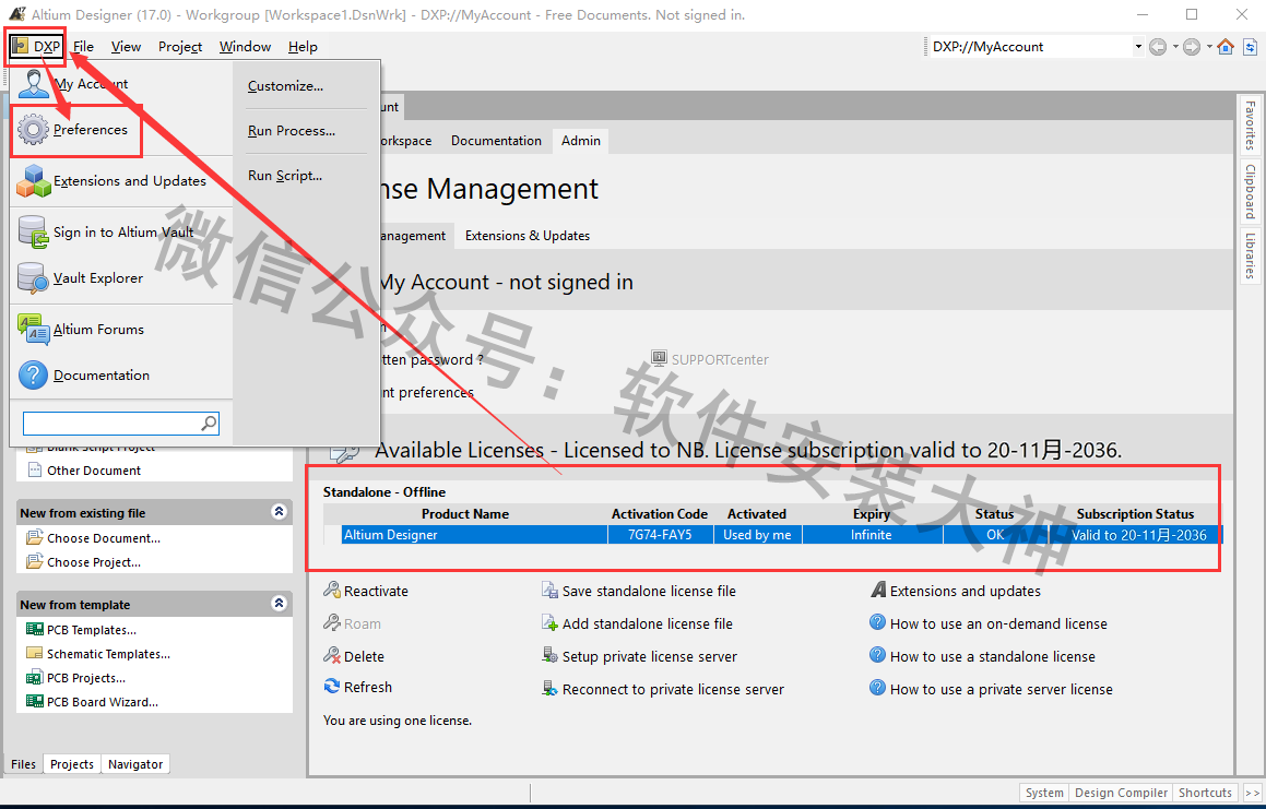 17、显示许可成功,点击左上角<DXP>选择点击《Preferences》设置图标