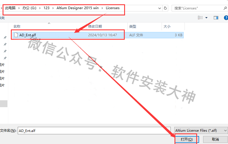 20、在弹出的对话框内,打开到解压出来的安装包,找到《Licenses》文件夹,然后打开文件夹,选中里面的文件,点击《打开》