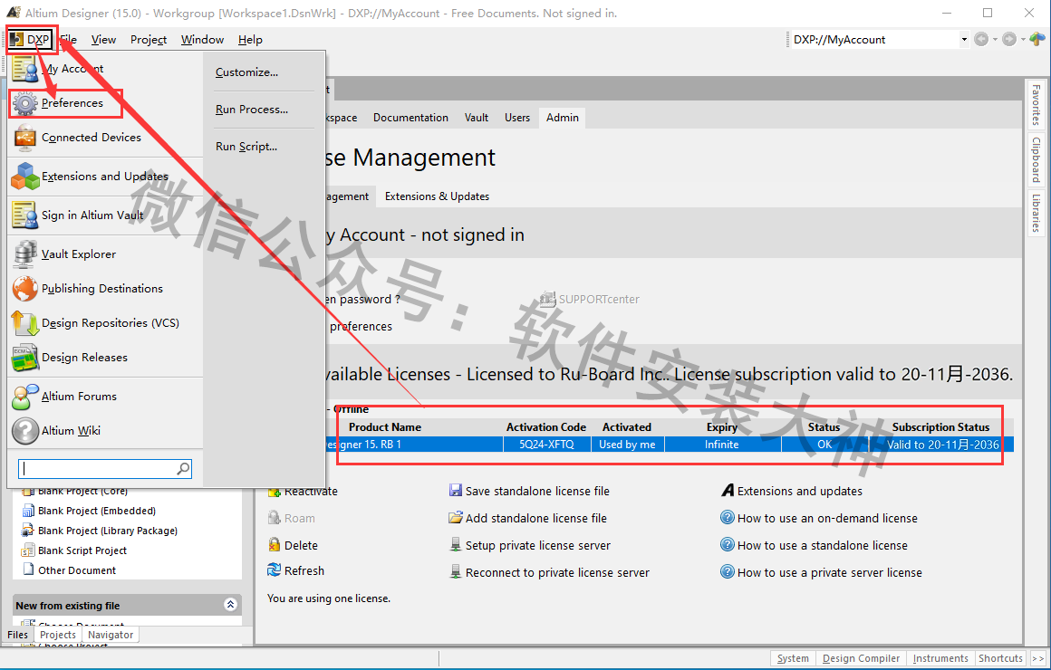 21、显示许可成功,点击左上角<DXP>选择点击《Preferences》设置图标