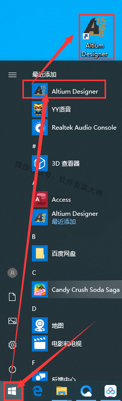 12、软件安装后快捷方式图标不会自动出现在桌面,左键点击【开始菜单】,在所有应用中找到【Altium Designer】,左键按住直接拖到桌面。
