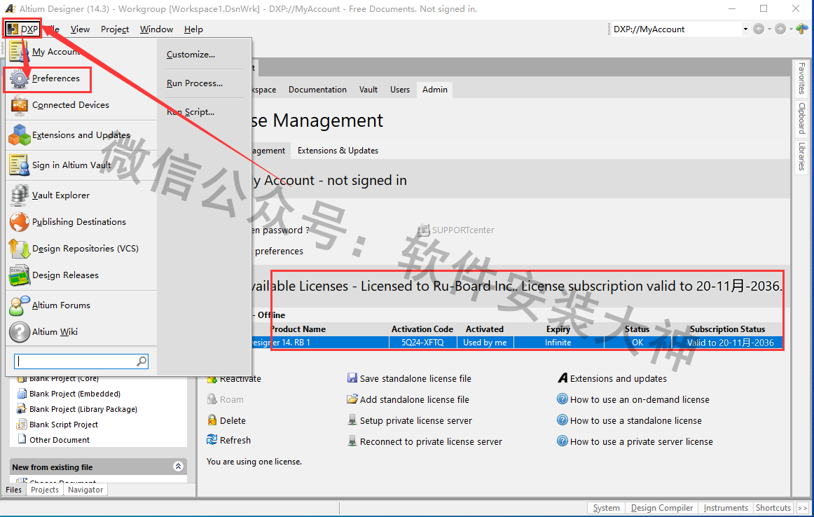 21、显示许可成功,点击左上角<DXP>选择点击《Preferences》设置图标