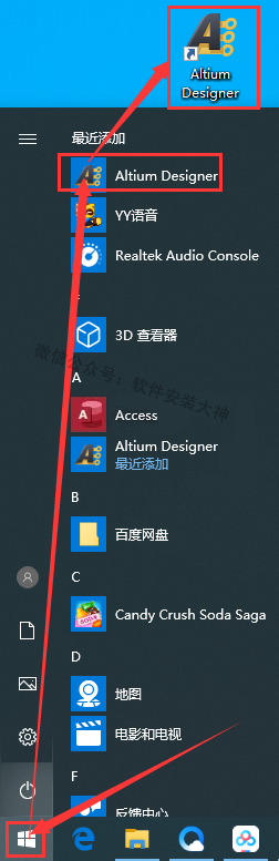 12、软件安装后快捷方式图标不会自动出现在桌面,左键点击【开始菜单】,在所有应用中找到【Altium Designer】,左键按住直接拖到桌面。